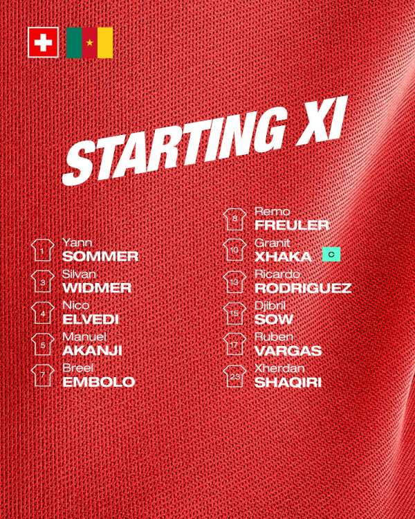 世界杯小组赛组G第一轮瑞士vs喀麦隆的比赛将于北京时间18点打响。赛前,双方公布了首发阵容。瑞士首发:1-索默、3-维德默、4-埃尔维迪、5-阿坎吉、7-恩博洛、8-弗鲁勒、10-扎卡、13-里卡多-罗德里格斯、15-索乌、17-鲁本-巴尔加斯、23-沙奇里