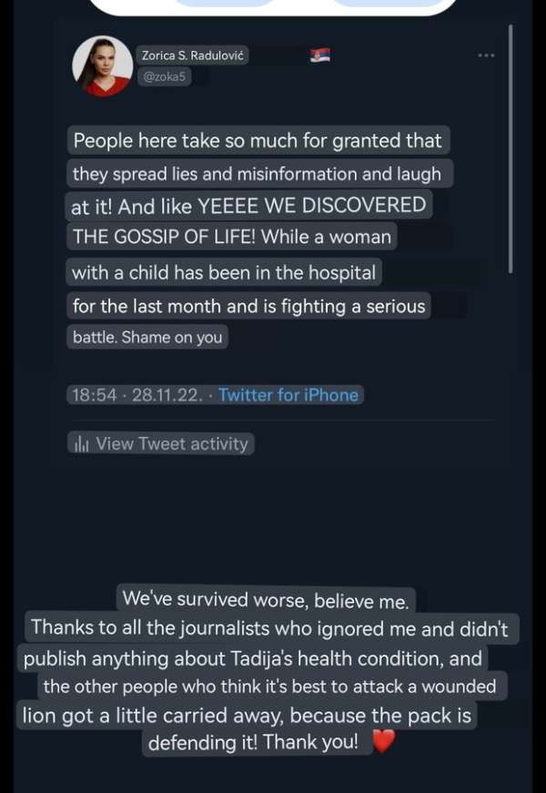 我们经历过更糟糕的,相信我。感谢所有无视我的记者,没有发表任何关于塔蒂佳健康状况的消息,以及其他认为最好攻击一只受伤的狮子的人,谢谢你们!”