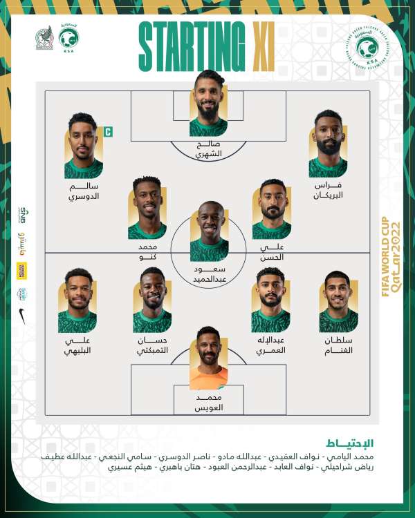 沙特替补:1-穆罕默德-阿尔亚米、22-纳瓦夫-阿奇迪、3-阿卜杜拉-马杜、14-阿卜杜拉-奥泰夫、16-萨米-纳吉、24-纳赛尔-多萨里、26-利雅德-沙拉希利、18-纳瓦夫-阿尔阿贝德、19-哈坦-巴赫布里、25-海赛姆-阿西里、20-阿尔-阿布德