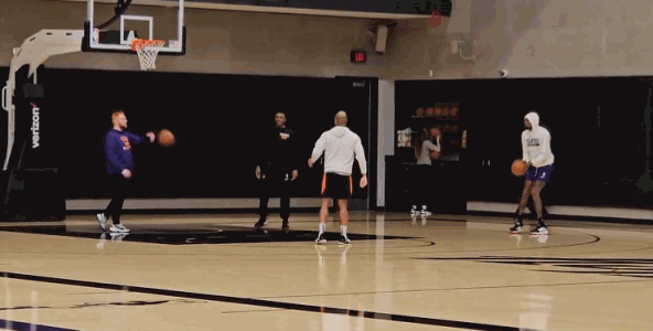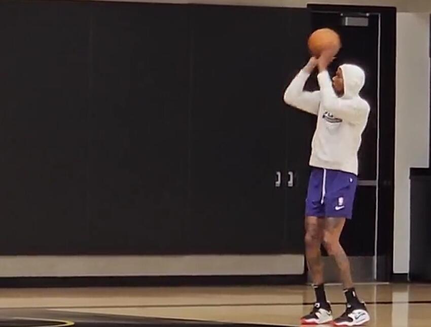 身穿白色兜帽衫的杜兰特,先从篮下投篮开始,或许是有段时间没有打球,杜兰特也出现了篮下投篮连续两次不中的情况。中投时,同样的情况也出现了。看到杜兰特连续命中很常见,像这样连续不中,真的比较罕见,他需要时间找状态。
