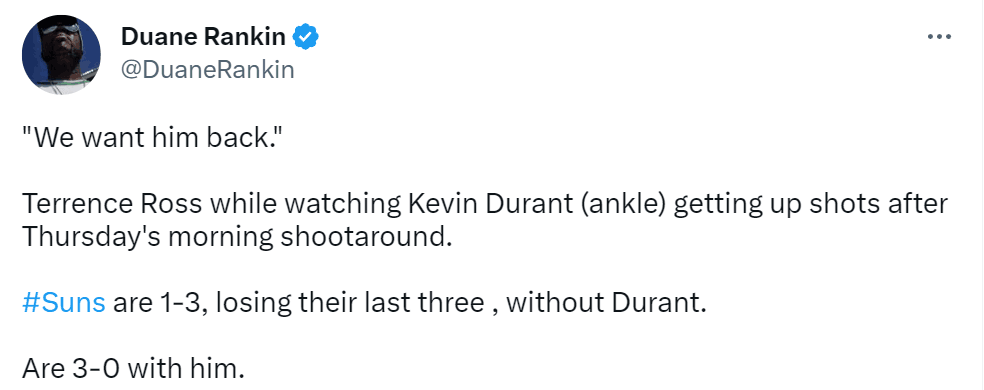杜兰特此前在主场球馆热身时意外受伤,休战至今。数据显示,杜兰特加盟太阳后,他出战的比赛,太阳3胜0负,而他缺席的比赛,太阳1胜3负。队友特伦斯-罗斯在谈到杜兰特时说:“我们想要他回来!”赛季至今,太阳37胜32负,排名西部第四。杜兰特本赛季场均29.5分6.8篮板5.2助攻,投篮命中率56.6%,加盟太阳后的3场比赛,场均26.7分7.3篮板3.7助攻,投篮命中率69%。