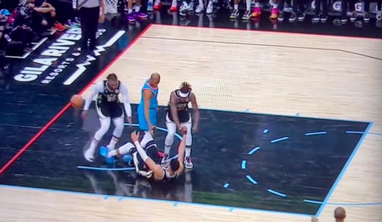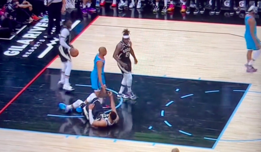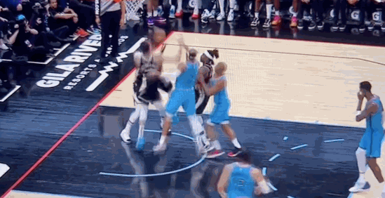 字母哥篮下争抢篮板,身体失去平衡,倒在了地上。保罗看到了倒在地上的字母哥,转身就要去扶起他。字母哥看了一眼保罗伸过来的手,犹豫了一下。