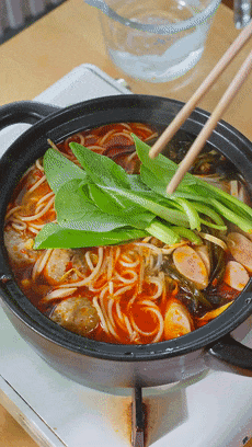 像是丸子这种不太爱熟的食材先放,煮个2分钟吧,再把海带丝、豆芽、干豆腐丝和香肠片这些东西都放进去。
