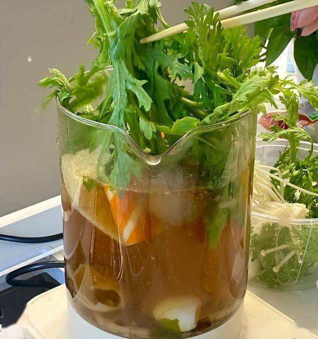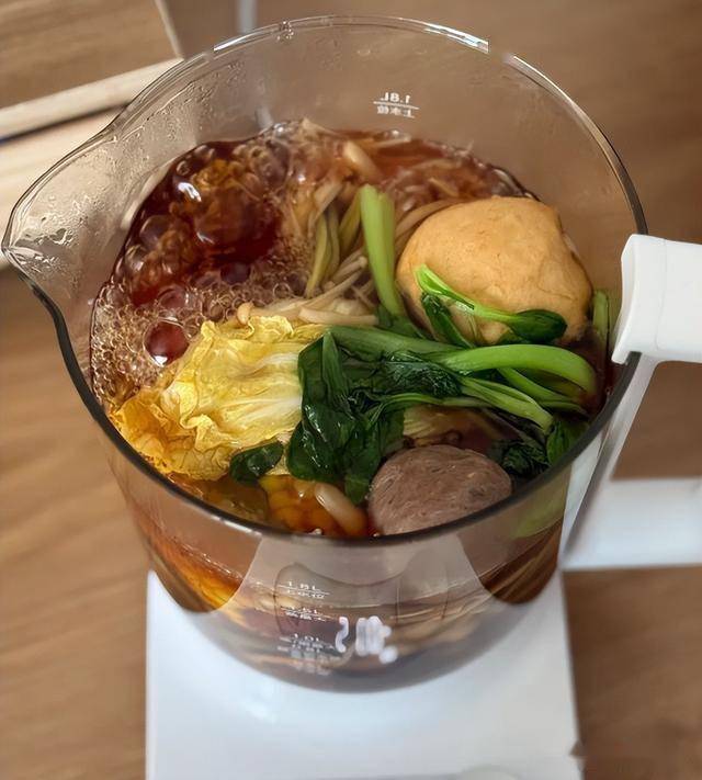 料汁往养生壶里面一倒,加入清水后,可以把喜欢吃的食材往里面煮一下,在办公室也是吃上热腾腾的饭菜了。