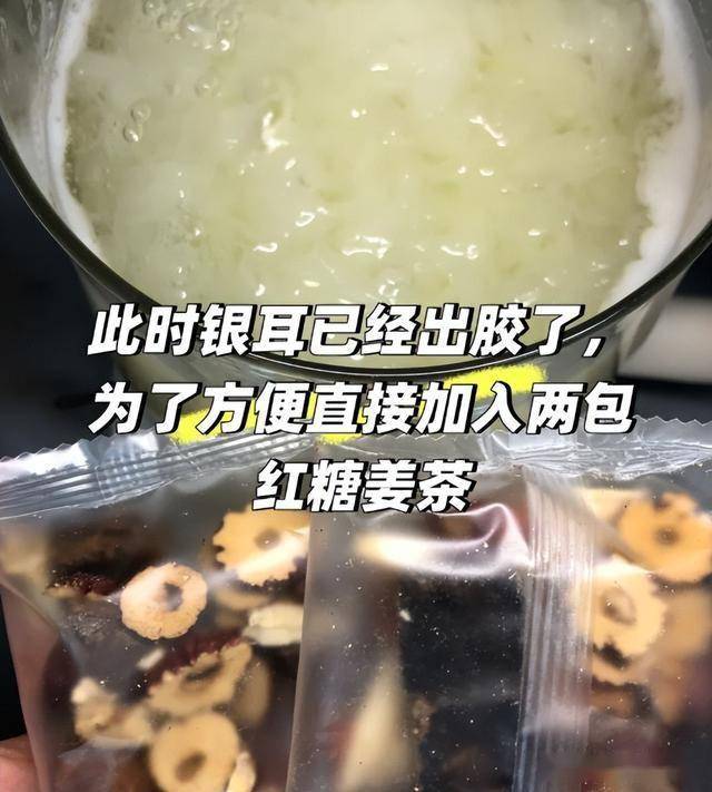 熬到银耳出胶之后,再把准备好的红糖姜茶放进去,没有红糖姜茶,直接放红枣、枸杞、冰糖都可以。