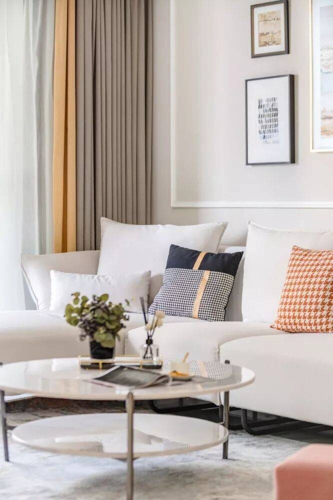 客厅以奶茶色作为优雅的底调,电视墙面的深色正好与大面积的浅色调相平衡。灰色的窗帘拼上一条亮黄,在平静中扬起活泼的波澜。