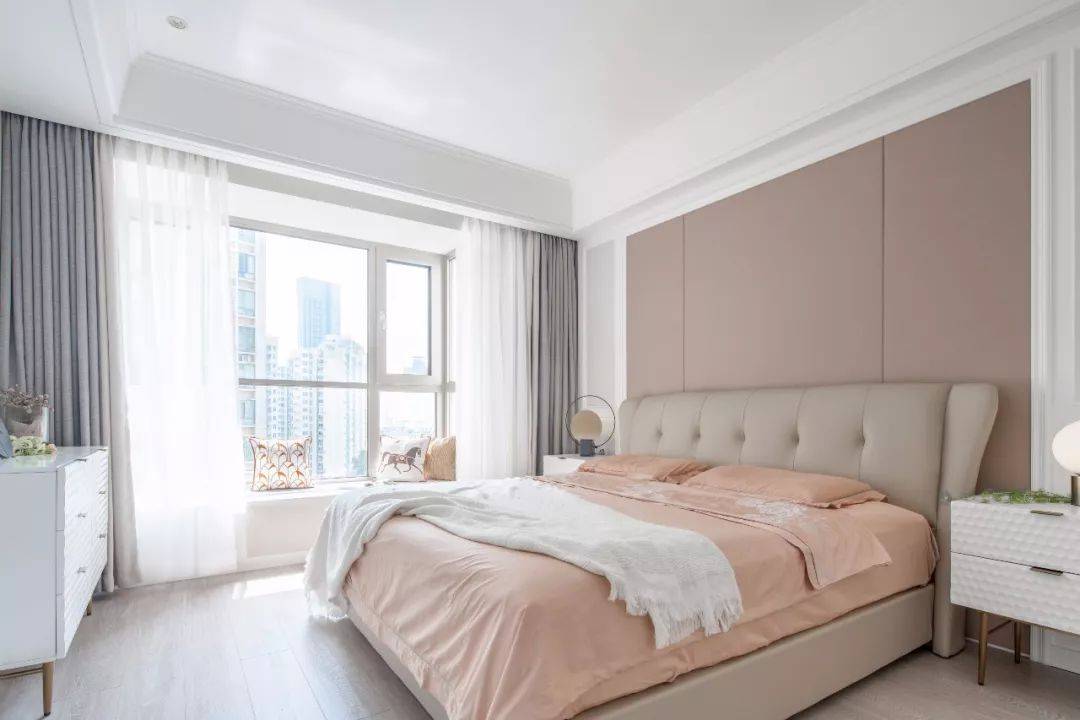 主卧以白色和粉咖色为主调,将温情与雅致融于空间里,整体柔和而内敛。