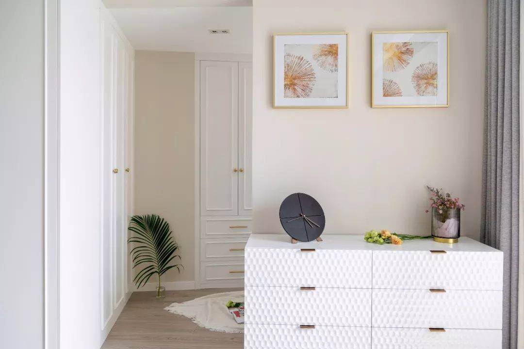 主卧看向衣帽间,床尾的斗柜设计收纳力与装饰效果兼备,格调满满的装饰摆件与花束绿植让空间洋溢着精致浪漫的气息。