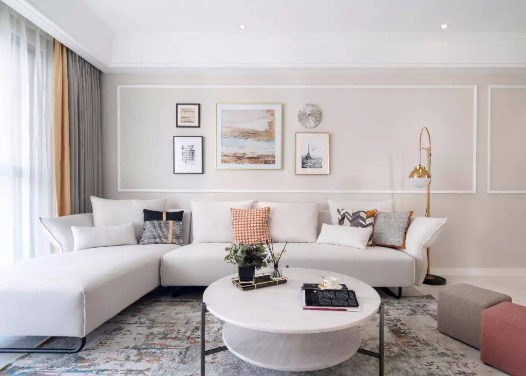 沙发背景墙简单的做了线条造型,精心挑选的挂画品味十足,亮黄亮橘慢慢的拉开层次,少许金色元素提升空间精致度,在复古调的地毯搭配下,整体呈现出华丽而又温馨的气质。