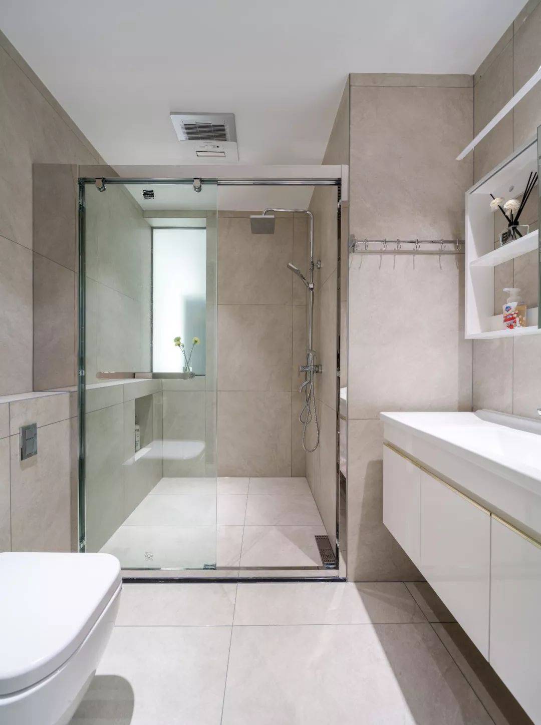 卫生间采用了墙排式马桶,矮墙延伸到淋浴房,留出壁龛,既美观又兼具收纳的功能。