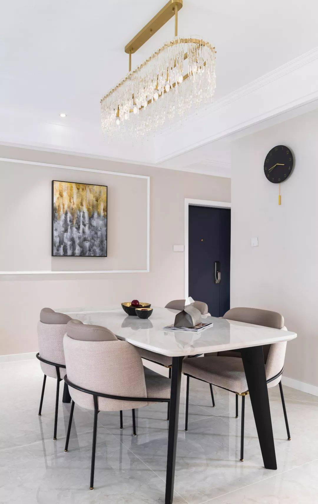 吊灯的璀璨与挂画的斑斓一脉相承,金色元素在空间中流动,整体典雅内敛不失华丽。