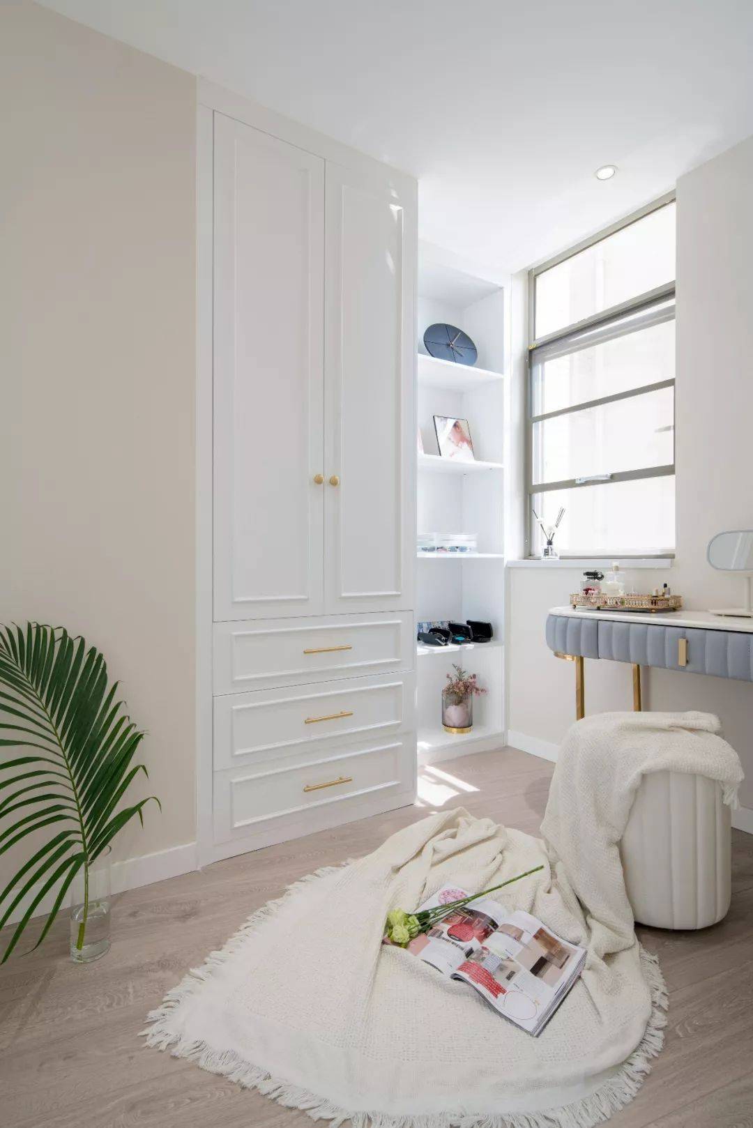 衣帽间,白色与金色的组合高级而温柔,靠窗的位置留给梳妆台,精致度满分。