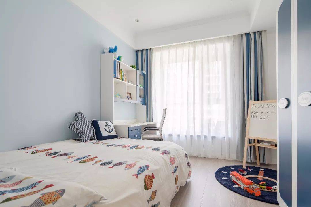 儿童房整体采用蓝白拼色,床靠墙布置,留出了较宽的活动空间,也保持了流畅的动线。