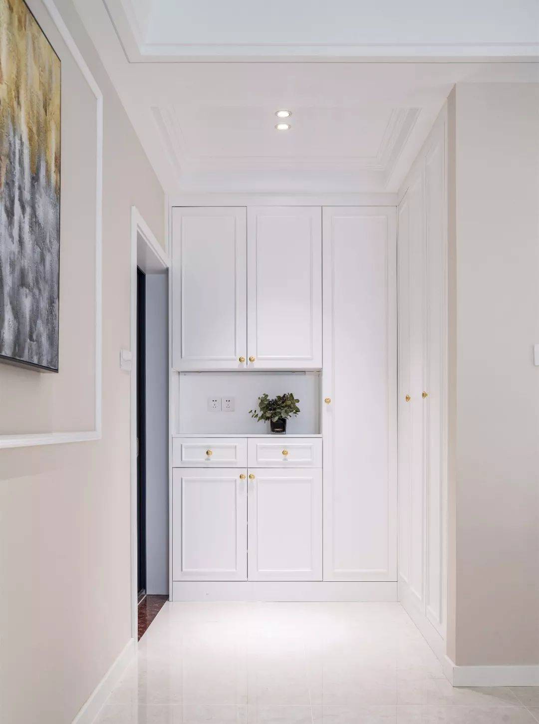 功能性玄关收纳量十足,白色柜门搭配金色拉手,精致的细节一进门就能感受到。